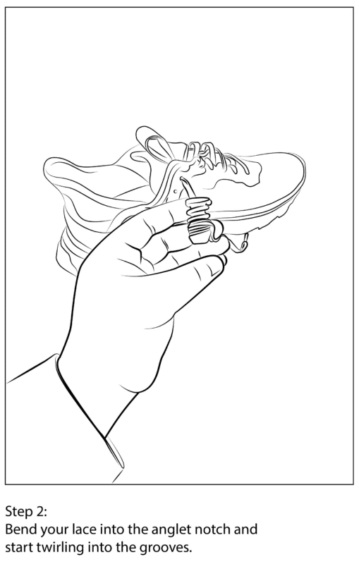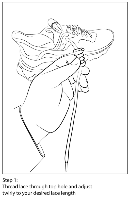 Tuck excess lace back into the top hole at the ball intersection. Once your lace is tucked in properly, tug on the accessory to lock in your lace. Make sure your twirled accessory is not more than one and a half inches from your shoe eyelid for adult and one and three tenths for kids